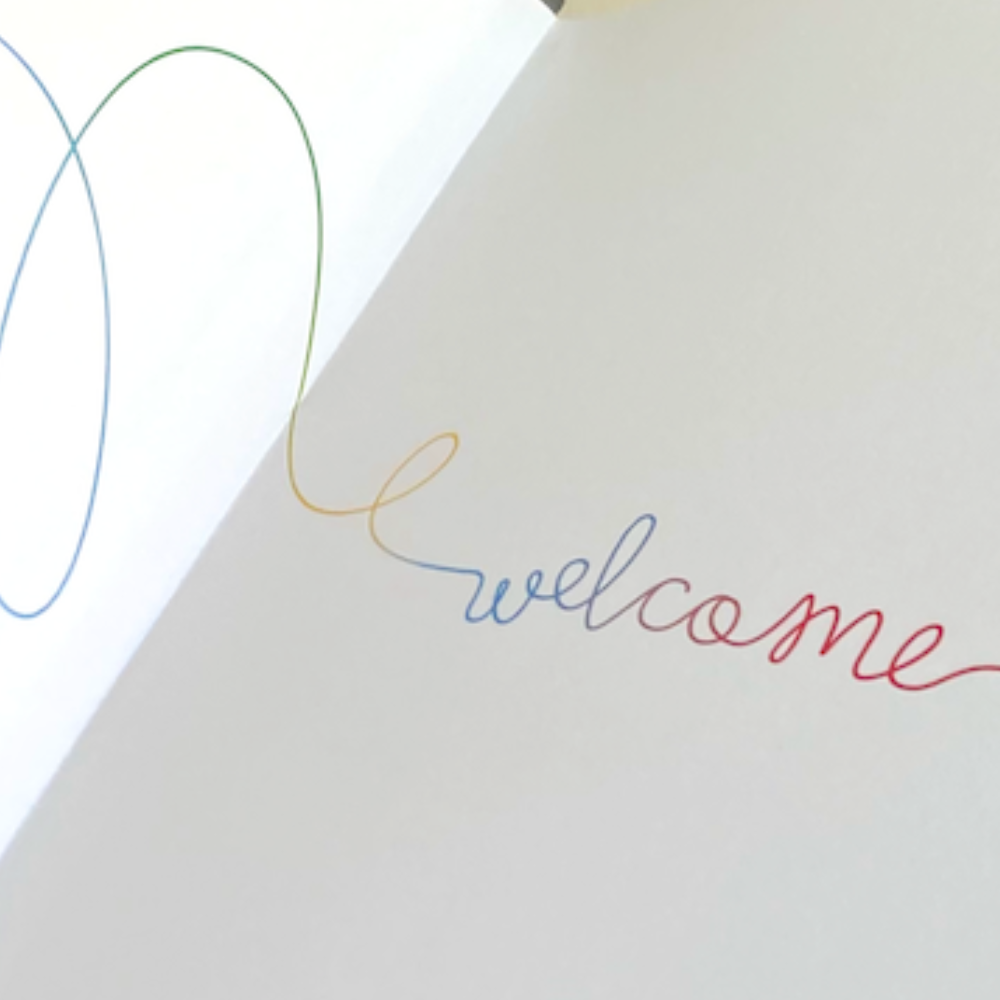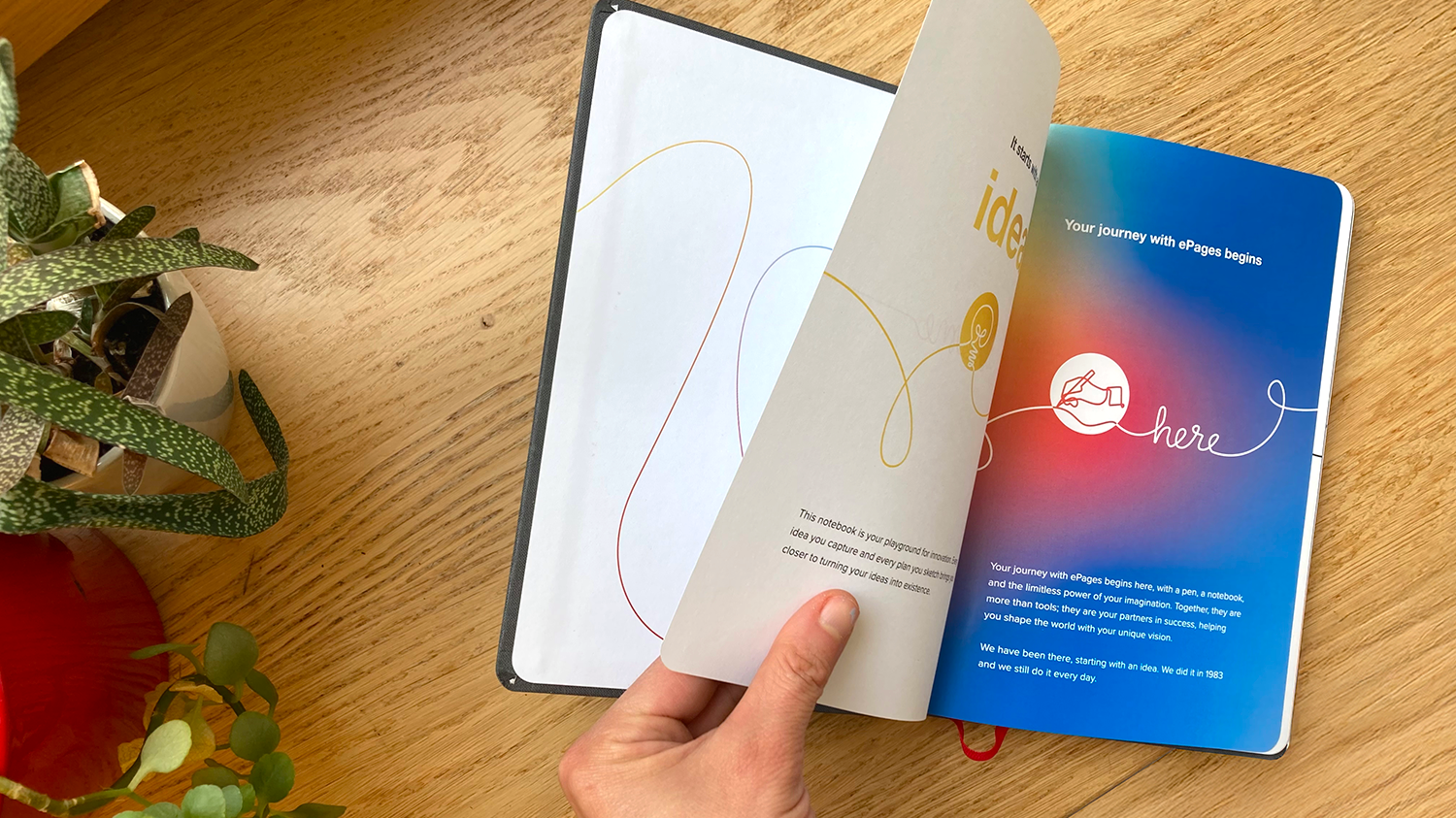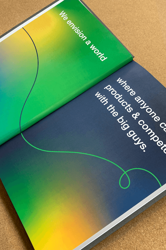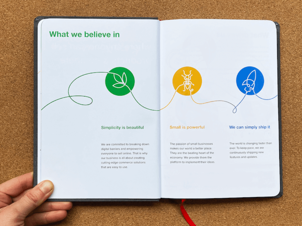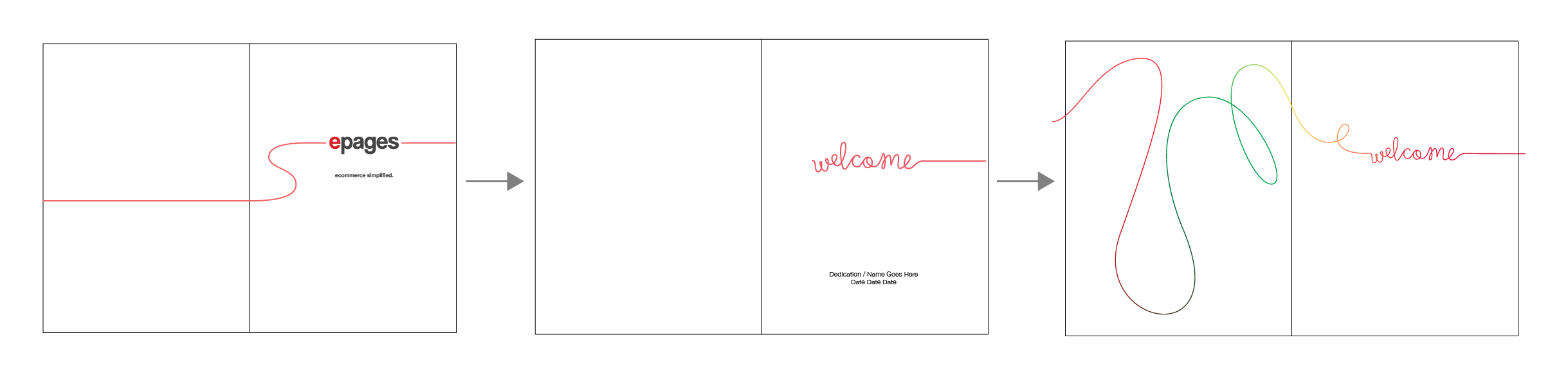 Inspired by the conversations we had around a timeline of the company history, and the overall business goal of "simplifying e-commerce", I decided that a single continuous line could be a powerful (and flexible) motif to tie the book's content together. A line can be whimsical, expressive, and minimalistic. It could also fit with the bright colours of the company's branding booklet.