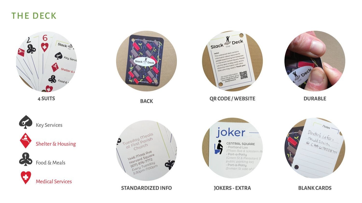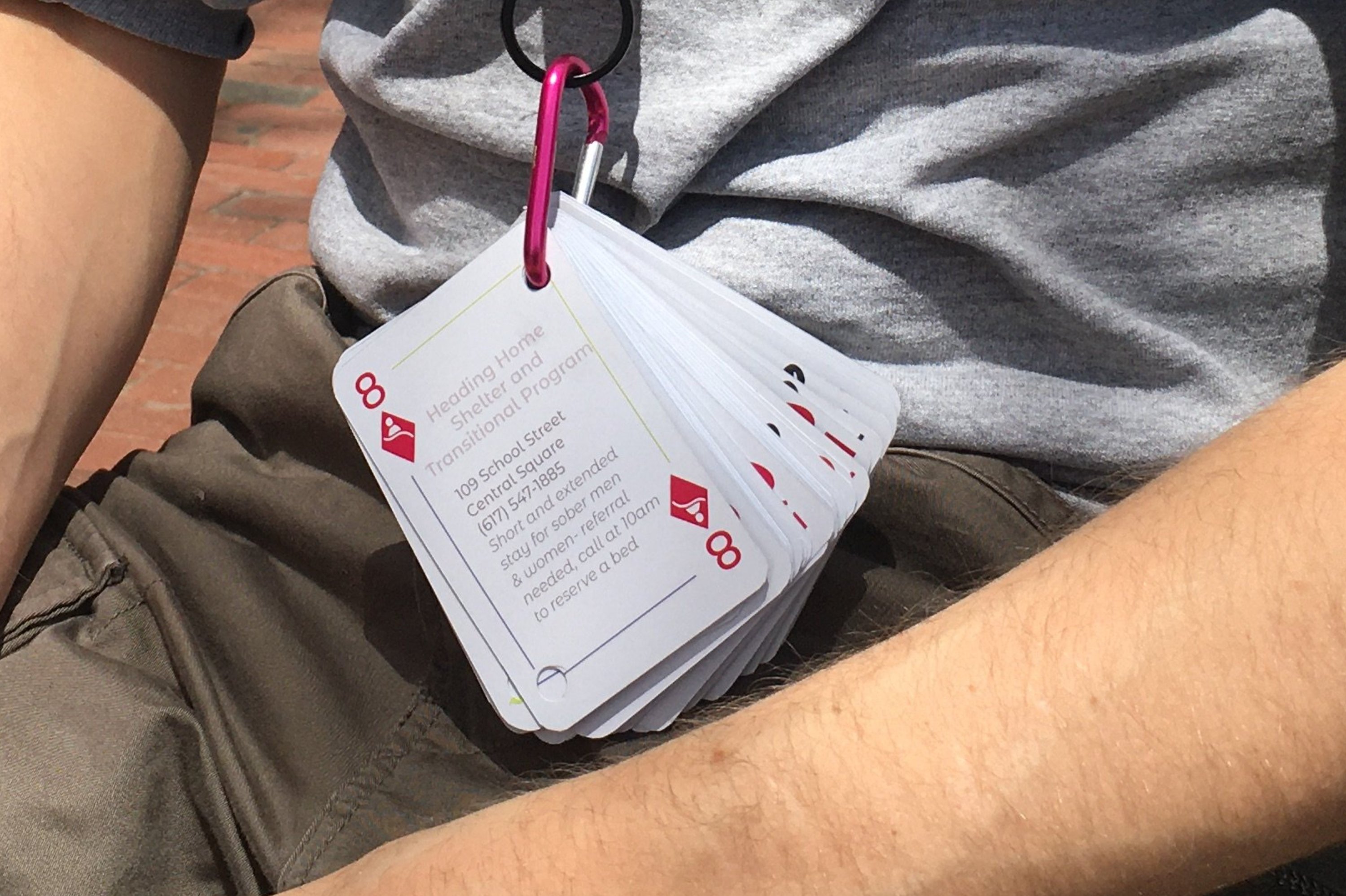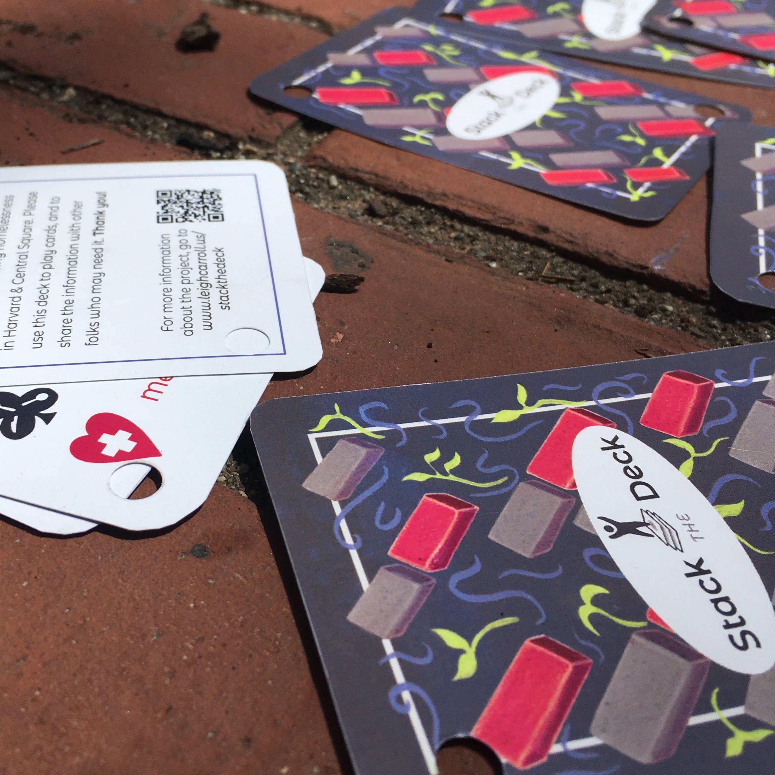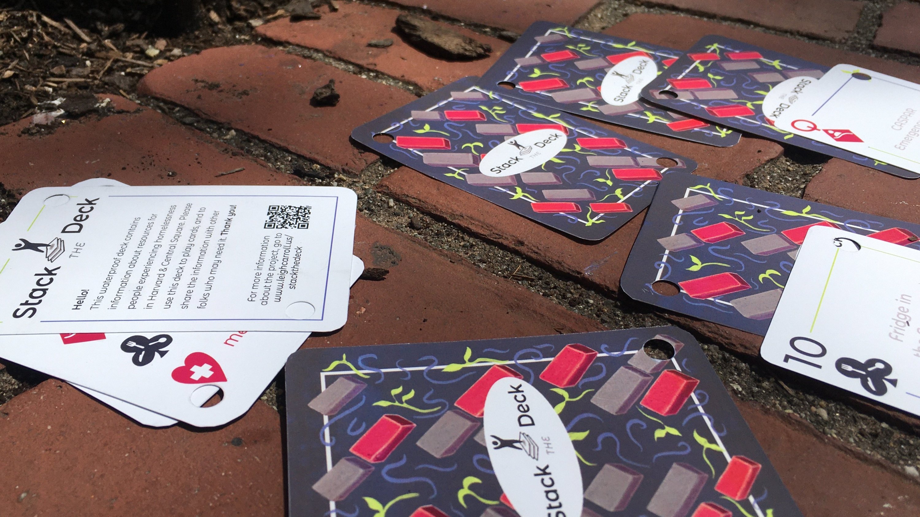 Stack the Deck is a deck of waterproof playing cards, printed with information about resources that serve the unhoused populations in Cambridge, Massachusetts.