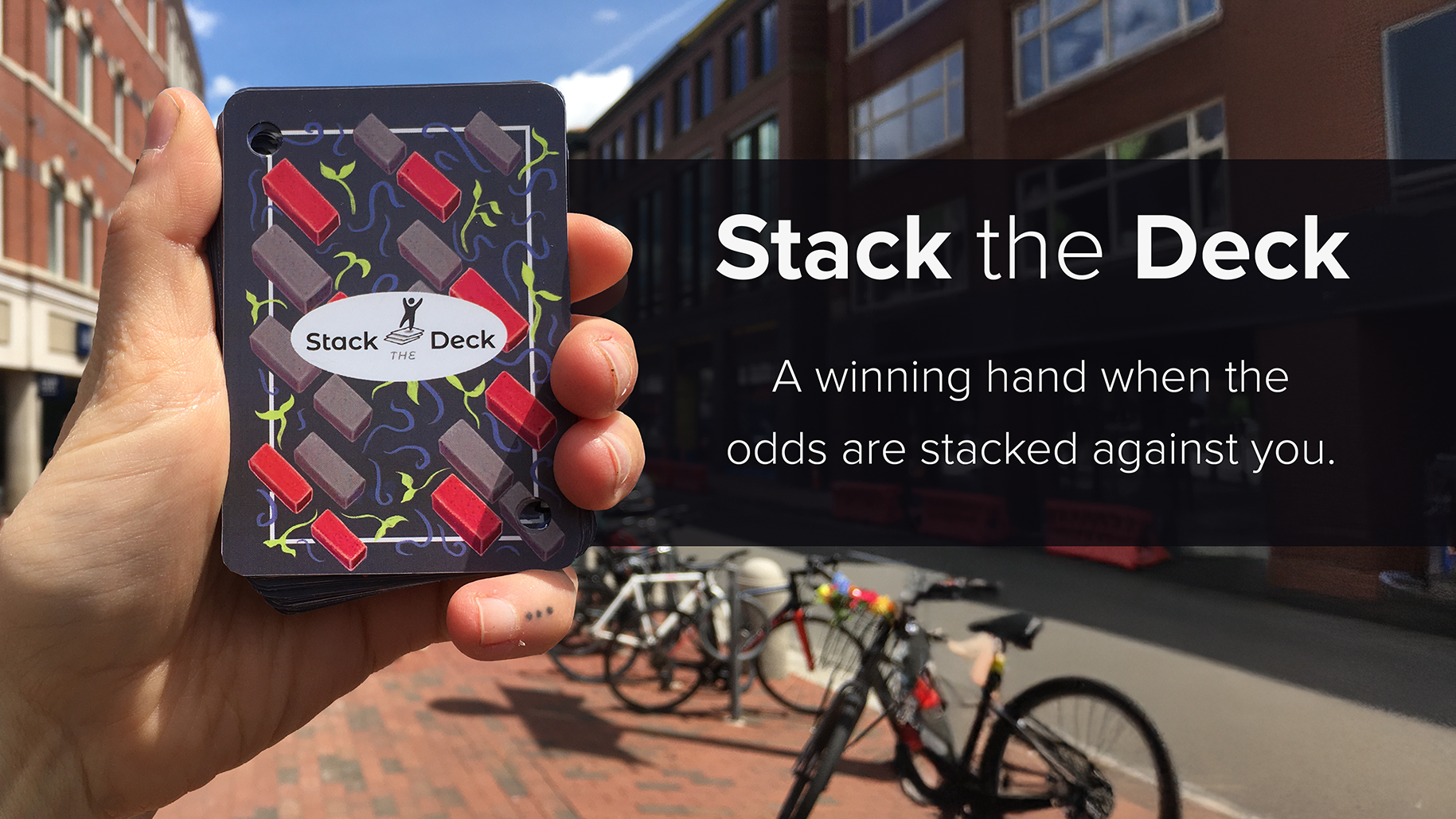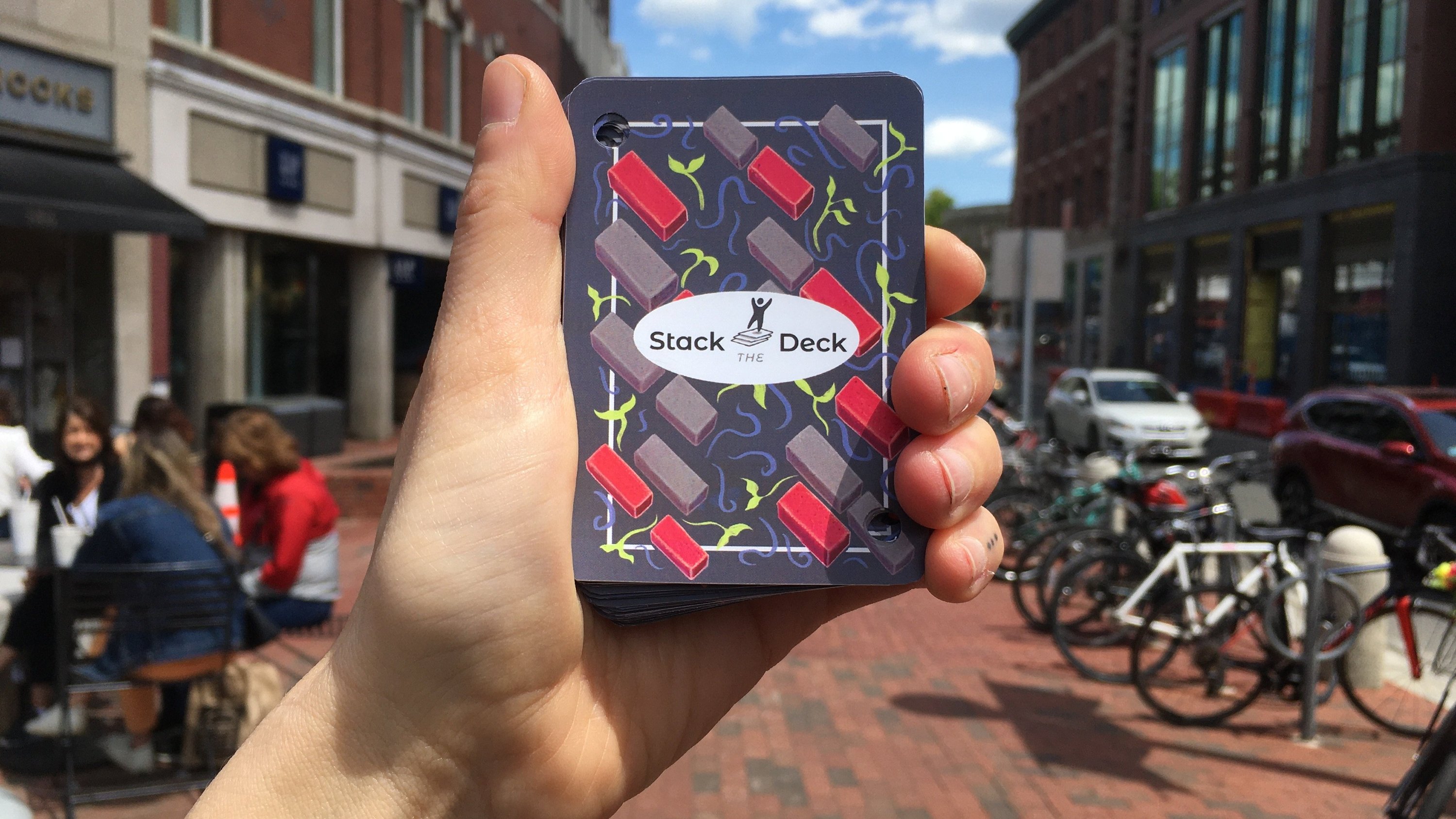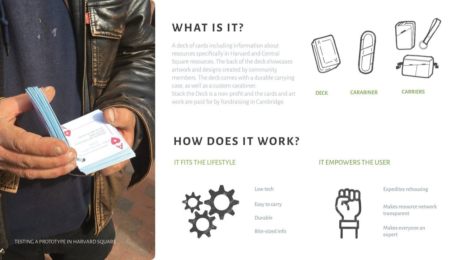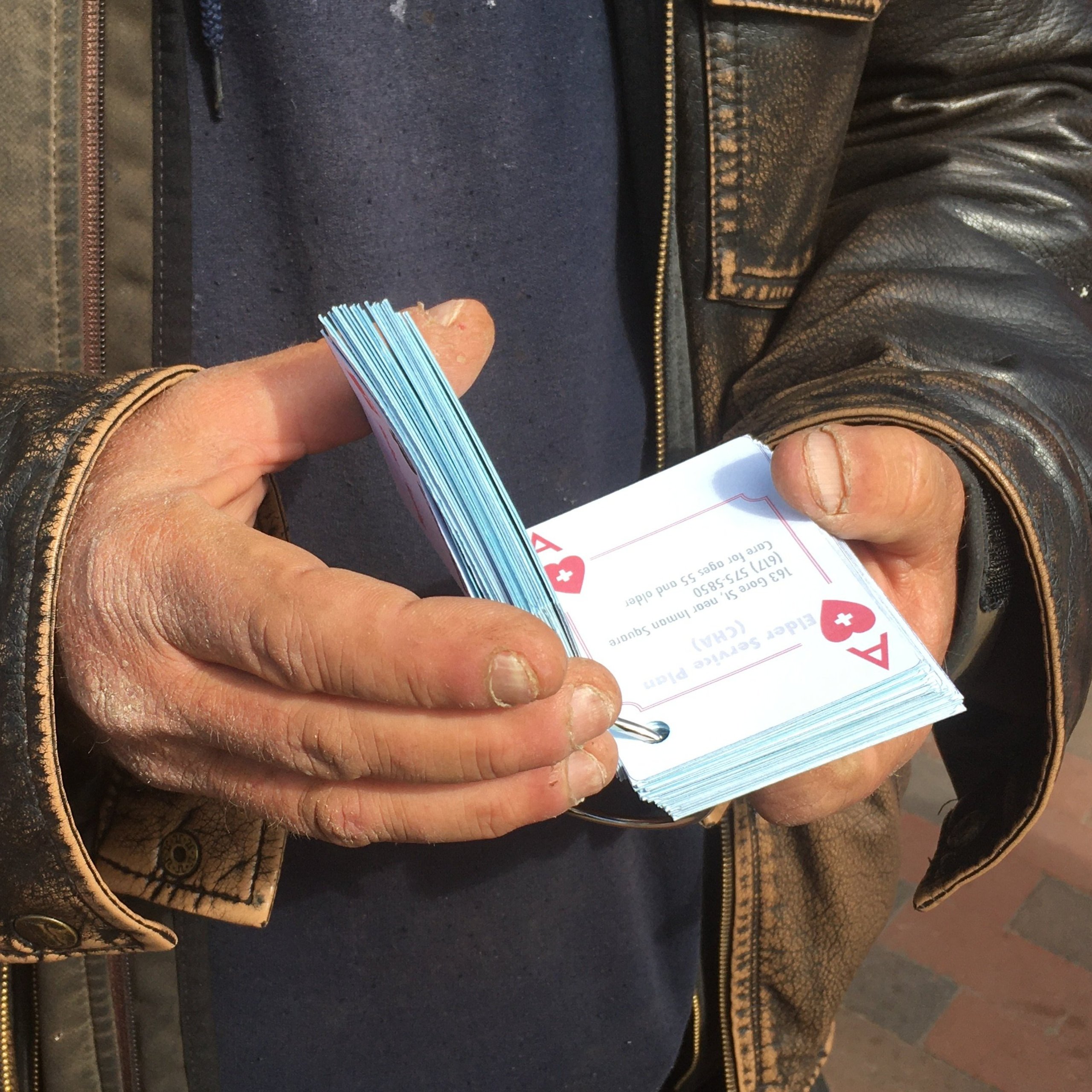 Stack the Deck is a deck of waterproof playing cards, printed with information about resources that serve the unhoused populations in Cambridge, Massachusetts.